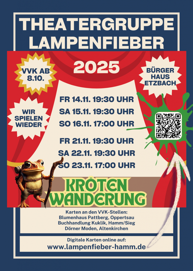 Die Theatergruppe Lampenfieber lädt ihre Gäste wieder herzlich ins Bürgerhaus in Etzbach ein. Erleben Sie mit uns während der Saison 2024 unvergessliche Theatermomente in unserer bekannten Spielstätte!